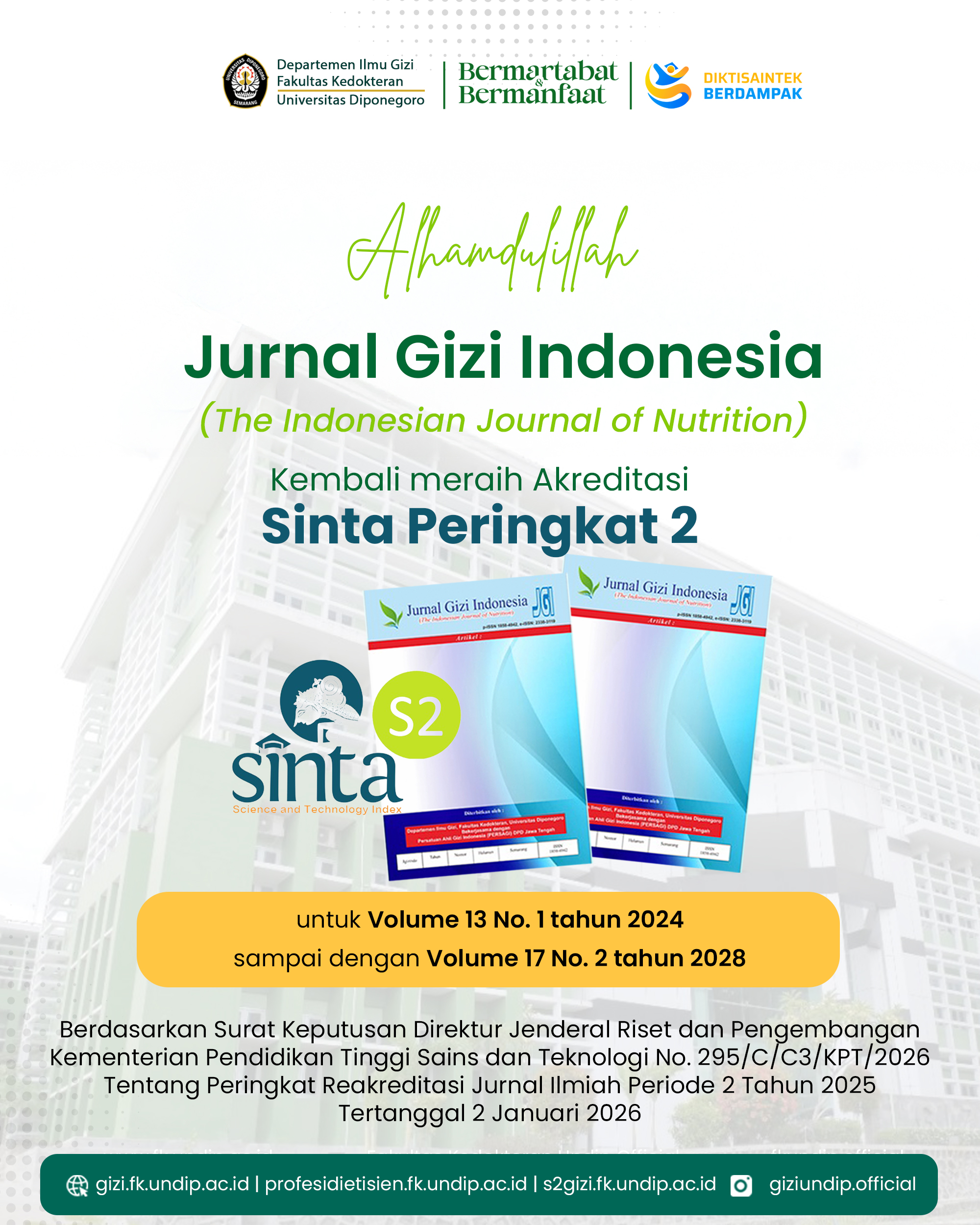 Jurnal Gizi Indonesia (JGI) Kembali Raih Akreditasi SINTA Peringkat 2