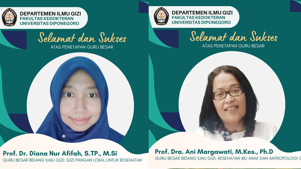 Selamat dan sukses kami sampaikan kepada Prof. Dra. Ani Margawati, M.Kes, PhD atas diraihnya Jabatan Akademik Guru Besar Bidang Ilmu Gizi: Kesehatan ibu anak dan antropologi gizi dan Prof. Dr. Diana Nur Afifah, S.TP, M.Si atas diraihnya Jabatan Akademik Guru Besar Bidang Ilmu Gizi: Pangan lokal untuk kesehatan. Semoga keilmuan beliau semakin memajukan perkembangan ilmu gizi dan Departemen Ilmu Gizi Universitas Diponegoro.