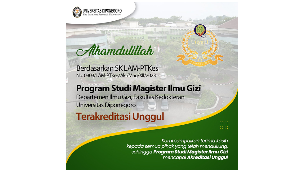 Berdasarkan penilaian lembar evaluasi diri dan dokumen kinerja yang telah disusun serta asesmen lapang yang telah dilakukan, Program Studi Magister Ilmu Gizi FK UNDIP berhasil mempertahankan status Akreditasi UNGGUL. Hasil ini tertuang dalam SK LAM-PTKes No. 0909/LAM-PTKes/Akr/Mag/XII/2023. Akreditasi Unggul menujukkan bahwa Program Studi Magister Ilmu Gizi FK UNDIP memiliki jaminan mutu yang unggul dan telah melampaui Standar Nasional. Hal ini menjadikan Program Studi Magister Ilmu Gizi FK UNDIP menjadi salah satu program studi Magister Ilmu Gizi terbaik di Indonesia yang tidak diragukan lagi kualitasnya.