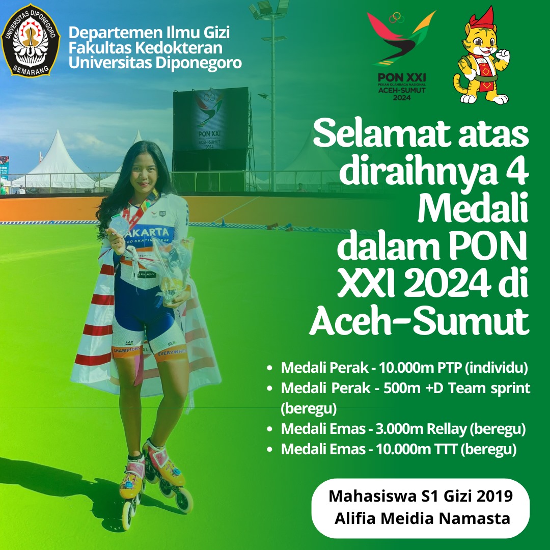 15 September 2024 — Alifia Meidia Namasta, seorang mahasiswi Program Studi S1 Gizi Fakultas Kedokteran Universitas Diponegoro, berhasil mencetak prestasi gemilang pada Pekan Olahraga Nasional (PON) XXI 2024 yang diadakan di Aceh-Sumatera Utara. Alifia sukses membawa pulang empat medali, terdiri dari dua medali emas dan dua medali perak, dalam cabang olahraga sepatu roda.