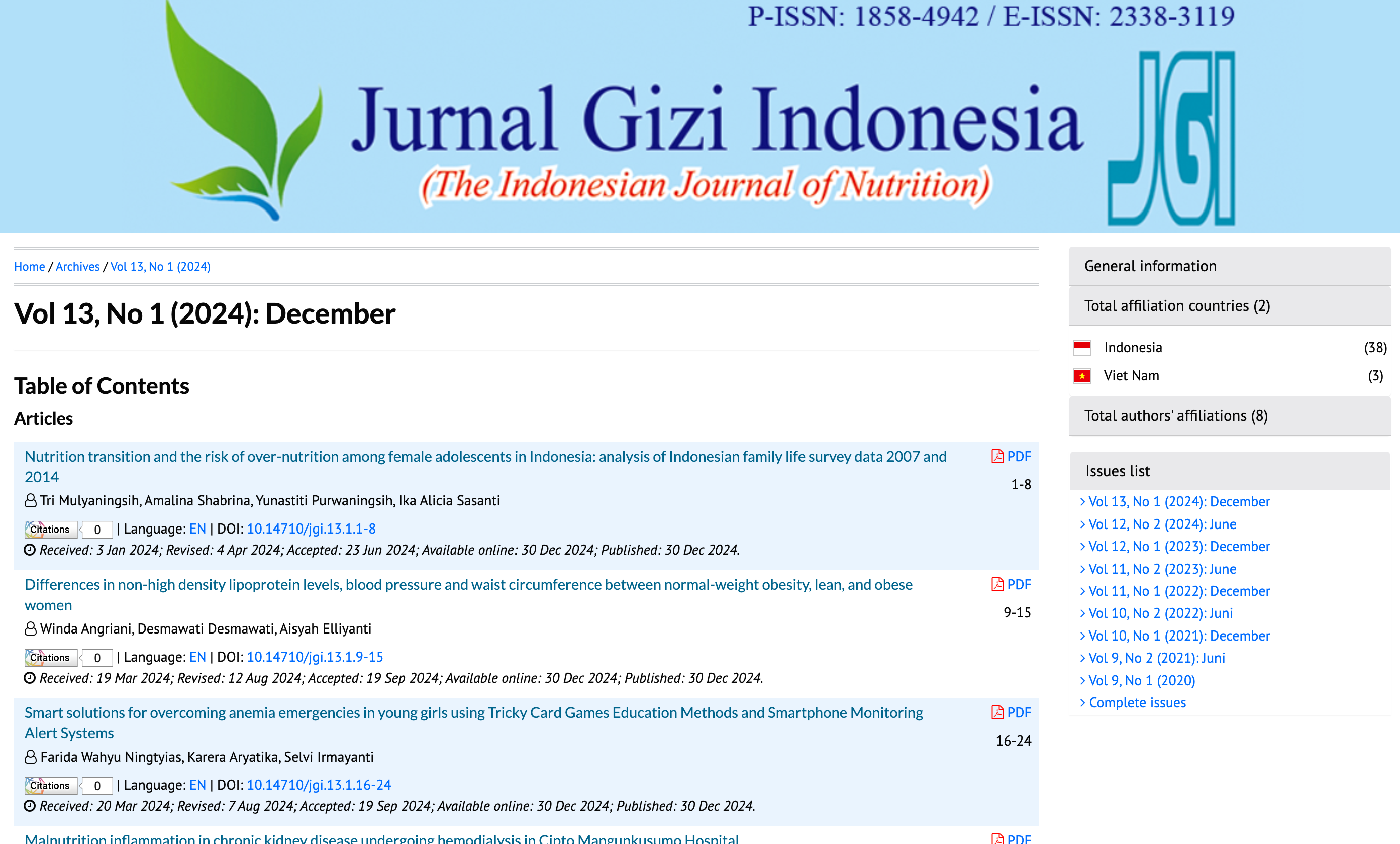 Jurnal Gizi Indonesia (JGI) telah menerbitkan edisi terbaru Volume 13 Nomor 1 untuk Desember 2024