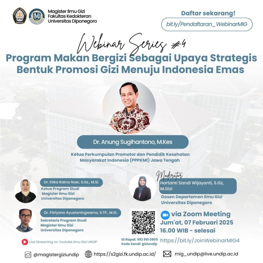 Semarang, 5 Februari 2025 – Magister Ilmu Gizi Fakultas Kedokteran Universitas Diponegoro (Undip) kembali mengadakan Webinar Series #4 dengan tema “Program Makan Bergizi Sebagai Upaya Strategis Bentuk Promosi Gizi Menuju Indonesia Emas”. Acara ini akan berlangsung pada Jumat, 7 Februari 2025 pukul 16.00 WIB melalui Zoom Meeting dan live streaming di YouTube Ilmu Gizi Undip.