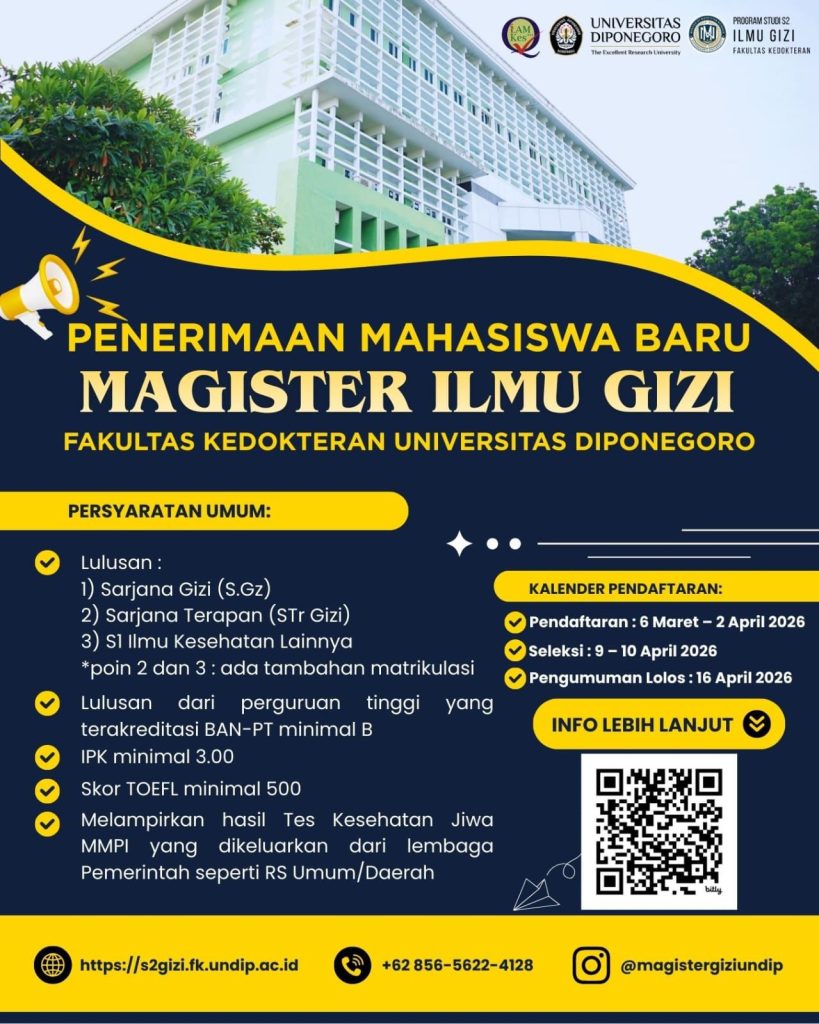 Universitas Diponegoro melalui Program Studi Magister Ilmu Gizi, Departemen Ilmu Gizi, Fakultas Kedokteran kembali membuka penerimaan mahasiswa baru untuk Semester Ganjil Tahun Akademik 2026/2027. Kesempatan ini menjadi peluang bagi para lulusan bidang gizi maupun kesehatan untuk melanjutkan studi ke jenjang magister sekaligus memperdalam keilmuan di bidang gizi dan kesehatan berbasis riset.